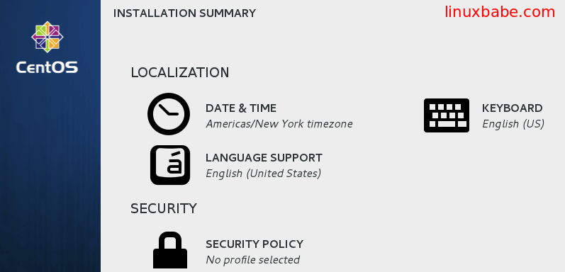 在安装概要(installation summary)这个界面,你可以配置系统的日期、时间、键盘布局、语言支持等。当你配置完一个模块时,点击左上角的完成(Done)按钮。