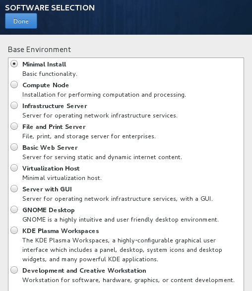 在软件选择(software selection)这一模块,你可以选择一种安装类型。你可以让CentOS成为一个计算机节点、基础设施服务器、文件和打印服务器、基本的网站服务器、或将它配置成一个桌面系统。如果你跟我一样是个Linux发烧友,那么你可以选择minimal install(最小化安装),这只会安装最基本的软件,其他软件要在系统安装完成后由自己安装和配置。