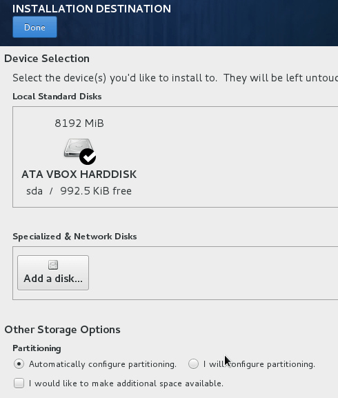 在安装目标(installation destination)这一模块,你可以让anaconda自动配置硬盘分区,或者可以自己手动配置硬盘分区。如果你的硬盘上已经有其他的操作系统,那么你需要手动配置分区。