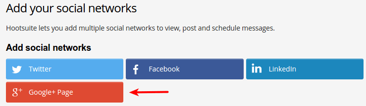 登录之后,点击Google+ Page按钮将你的Google plus主页添加到Hootsuite.