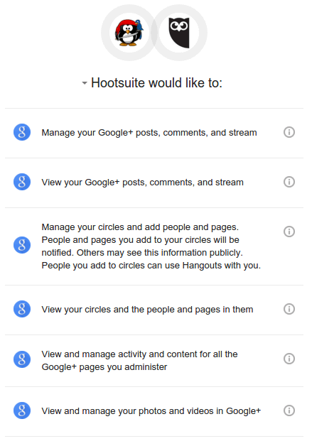 Hootsuite会征求你的允许,管理你的Google plus主页.
