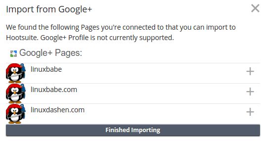 点击允许,然后选择你要导入的Google plus主页.点击Finished Importing.