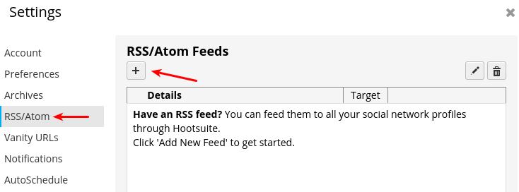 在新窗口中,选择左侧面板的RSS/Atom,然后点击+号按钮来添加你的WordPress网站RSS Feed.
