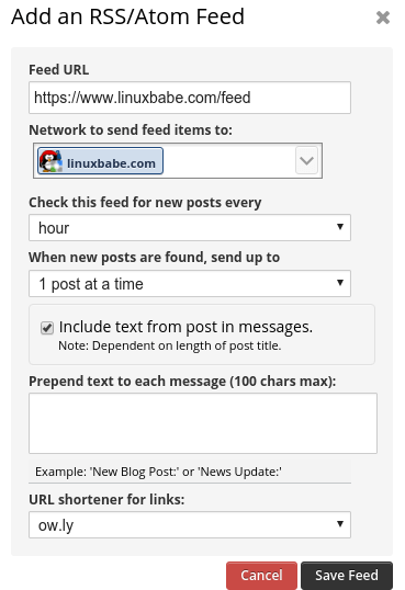 输入你的Feed URL.选择你的Google plus主页作为目标网络.指定Hootsuite检查Feed的频率.最后点击Save feed.
