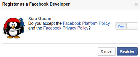 首先登录你的Facebook账号.然后前往Facebook开发者中心 https://developers.facebook.com. 如果你还没有注册为一个Facebook开发者,你需要点击蓝色的注册(Register)按钮.然后接受Facebook平台政策和Facebook隐私政策.点击注册按钮.
