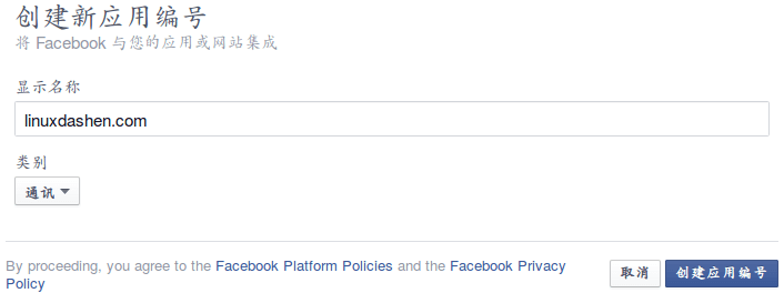 为你的Facebook App起个名字,选择一个类型.你可以用你的域名来命名,比如linuxdashen.com.完成后点击创建应用编号.