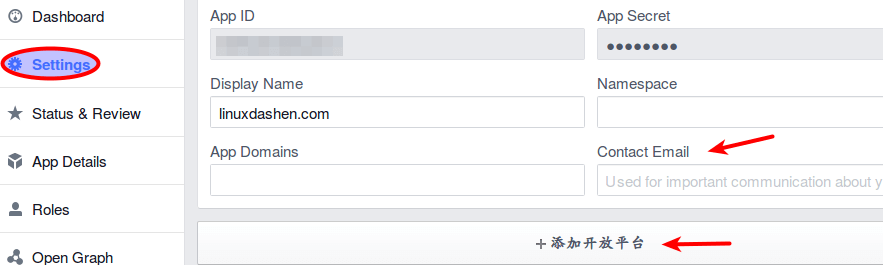 在左侧面板选择Settings. 在Contact Email一栏输入你的邮箱,然后点击添加开放平台.