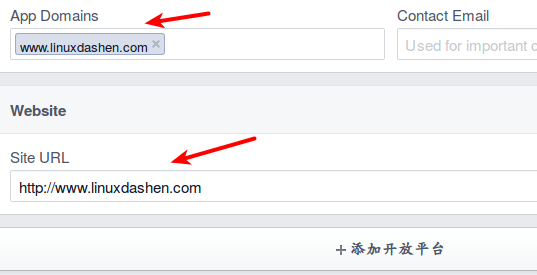 在Site URL一栏填入你的WordPress地址,在App Domains一栏填入你的站点地址.在WordPress仪表盘里常规设置中可以找到你的WordPress地址和站点地址.注意,linuxdashen.com和www.linuxdashen.com是不一样的.在App Domains一栏中不需要添加http://.