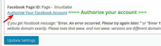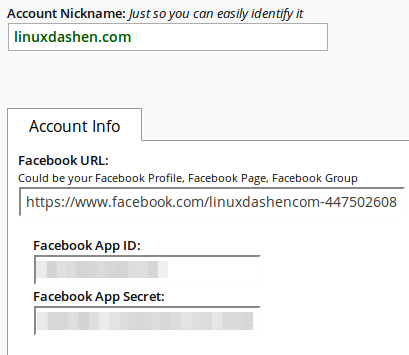 在Account Nickname一栏中可以填写你的域名.在下一栏填写你的Facebook URL. 我填写了我的Facebook主页URL,所以文章会自动推送到我的Facebook主页.然后在Facebook App中复制App ID和App Secret,将它们粘贴在下面两栏中.
