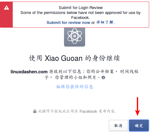 页面跳转到facebook网站.忽略警告信息,点击确认按钮.