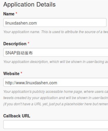 给你的Twitter App起个名字,写个简短的描述,填写网站URL. Callback URL可以不填.同意Twitter开发者条款,然后点击Create your Twitter Application.