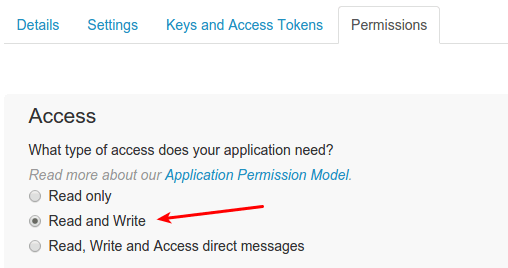 创建了Twitter App后,在新页面中点击permissions标签.选择 Read and Write.