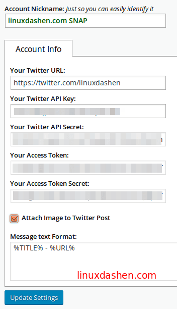 输入一个昵称,填写你的Twitter URL, Twitter API key, API secrect, access token, token secret. 勾选Attach Image to Twitter Post. 最后点击Update Settings.