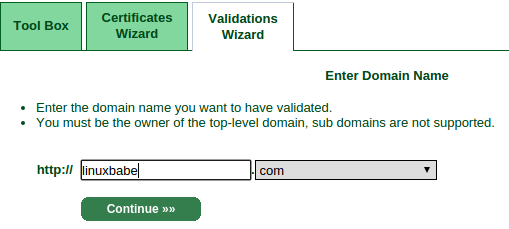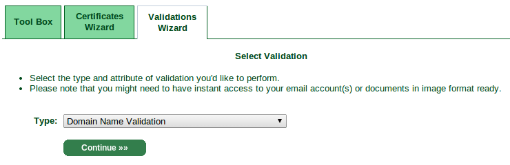 然后点击Validation Wizard标签,进入验证向导页面。选择Domain Name Validation进行域名验证。
