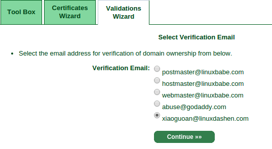 然后,他们会查询域名的whois信息,并询问你要使用哪个邮箱来接收验证码,其中有个邮箱就是whois信息查询出来的邮箱。选择一个可用的邮箱地址。