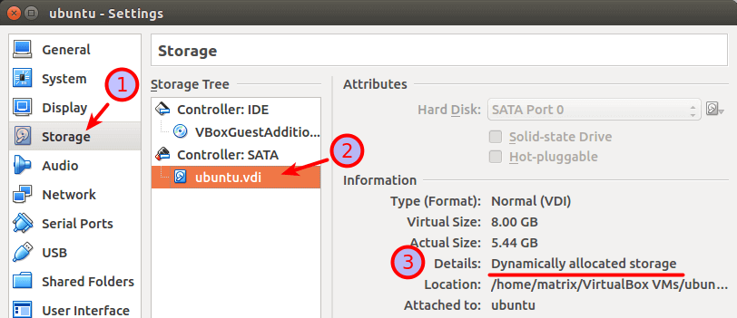 打开虚拟机的设置界面,在左侧栏点击存储.在存储树下面选择你的虚拟硬盘.在右边可以看见虚拟硬盘的信息.在下面可以看见,我的虚拟硬盘是动态分配大小的.
