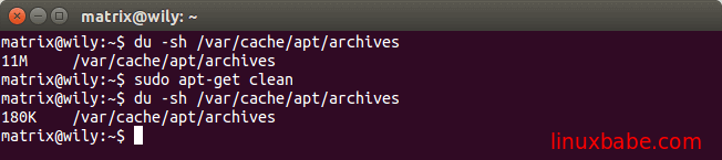 当apt-get安装或升级软件包时,它会将deb安装包下载到文件系统的/var/cache/apt/archives目录下.软件包安装完成后,这些deb安装包基本上就没有什么用处了.apt-get clean命令可以帮你删除这些deb安装包.