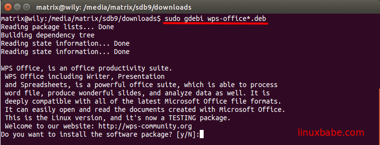 如果你从网站上下载了一个deb软件包,那么你需要dpkg工具来安装这个deb包.例如,你可以下载WPS linux版.然后,在终端里将当前工作目录切换到下载目录,再输入下面的命令安装WPS  Linux版.