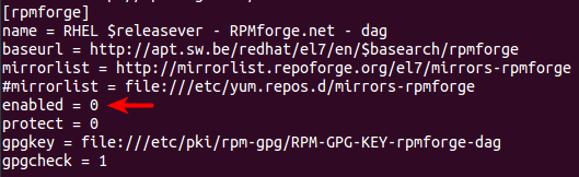 要禁用RepoForge,编辑/etc/yum.repo.d/rpmforge.repo文件。