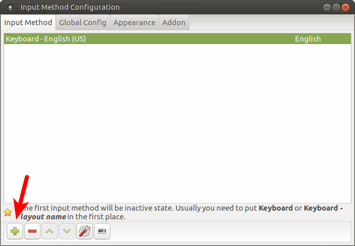 点击输入法配置窗口左下角的加号按钮以添加中文输入法。