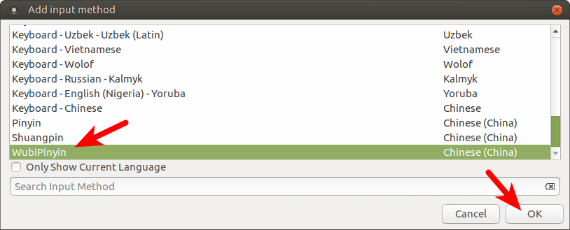 然后,在新的窗口中,去掉只显示当前语言(Only Show Current Language)的勾。在列表中选中五笔拼音输入法。我用英文版的Debian 9 Mate系统,WubiPinyin在列表的最下方。如果你用中文版,那么可能在列表的其他位置。