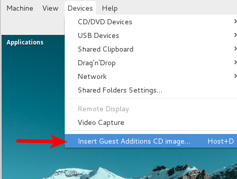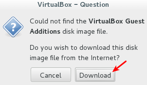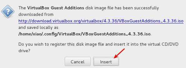 如果你的宿主机是Linux,那么增强功能的CD镜像会下载到~/.config/VirtualBox/目录下.下载完成后,点击插入(insert),将CD镜像插入到虚拟光驱中.
