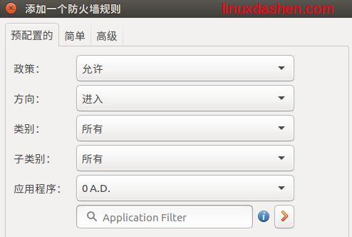 然后,你可为某个应用程序如0 A.D.添加规则,也可以为某个网络协议,如SSH,添加规则。