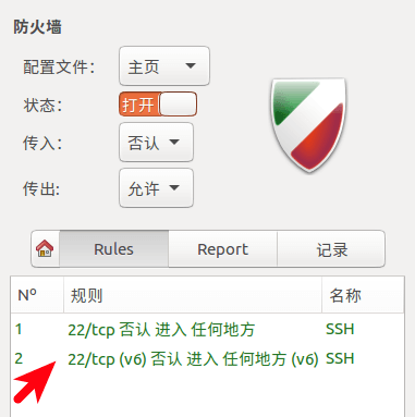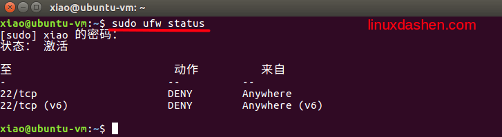 状态为激活,表示ufw防火墙正在工作,另外还可以看见我们添加的防火墙规则。