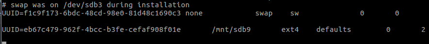 UUID=eb67c479-962f-4bcc-b3fe-cefaf908f01e /mnt/sdb9 ext4 defaults 0 2