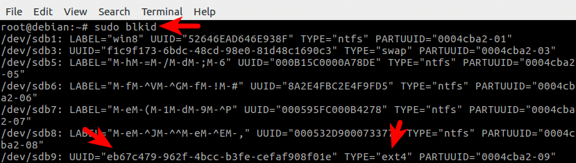 然后,查看这个分区的UUID和文件系统类型。从上图中可以看到,/dev/sdb9的UUID是eb67c479-962f-4bcc-b3fe-cefaf908f01e,它的文件系统类型是ext4。ext4是Linux的标配文件系统。