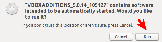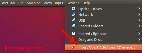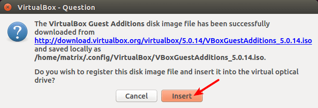 如果你的宿主机是Linux,那么增强功能的CD镜像会下载到~/.config/VirtualBox/目录下.下载完成后,点击插入(insert),将CD镜像插入到虚拟光驱中.