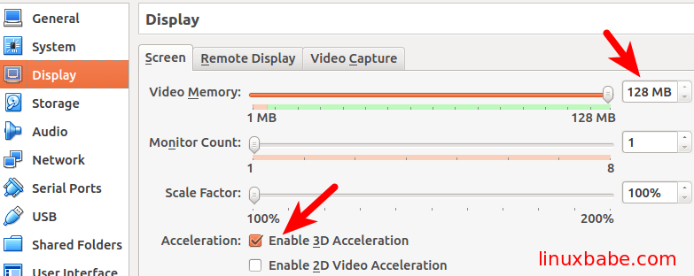 关闭ubuntu虚拟机.打开虚拟机设置界面.在左侧栏选择显示(Display).在屏幕(screen)标签中,为虚拟机分配128M显示内存.然后勾选启用3D加速(Enable 3D Acceleartion).保存设置.