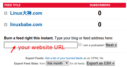 前往feedburner网站.用你的Google账号登录.登录后在文本框中输入你的域名,然后点击Next.