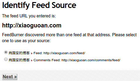 Feedburner会寻找你的网站Feed,如果你的网站是用WordPress搭建的,那么第一个Feed是文章Feed,第二个Feed是评论Feed. 选择文章Feed.