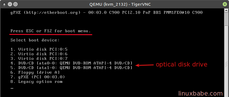 KVM虚拟化的VPS默认使用seaBISO作为固件,按ESC或F12键来选择从哪个设备启动VPS,在列表中选择从虚拟光驱启动。