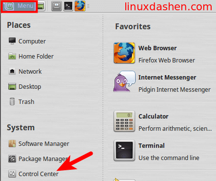 点击桌面的menu菜单,然后选择control center (控制中心)