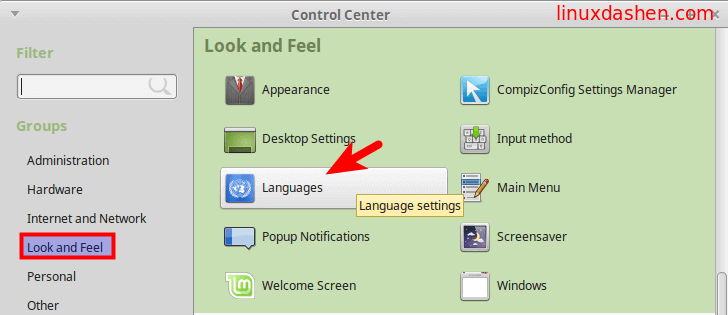 在控制中心的左侧栏点击Look and Feel,然后在右边的窗口里选择Languages.