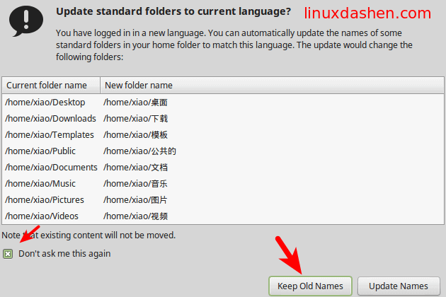 勾选Don’t ask me this again. 然后点击Keep Old Names以保留旧的英文名称.