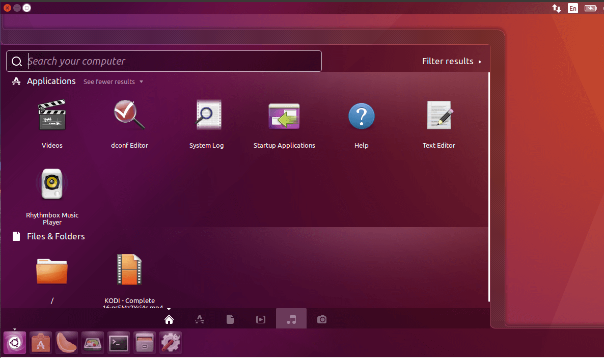 启动器移动到桌面底部后,Dash菜单会占据整个屏幕,我们可以点击左上角的最大化按钮来更改Dash菜单的大小。