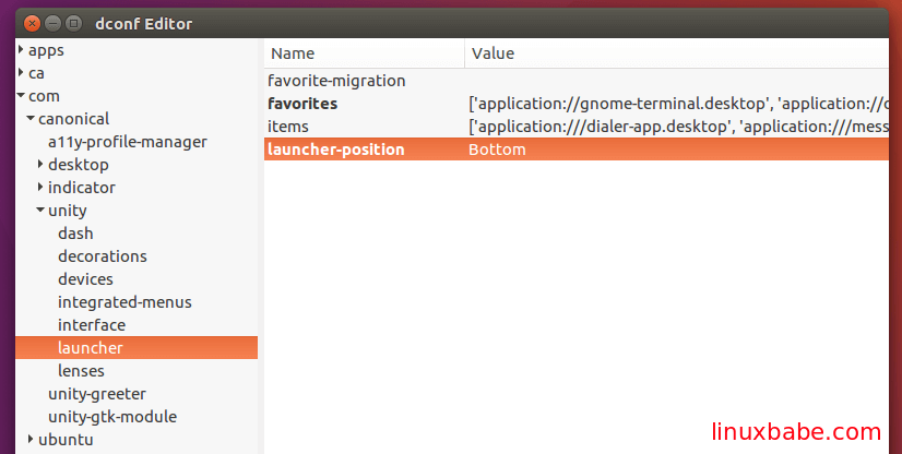 在左侧面板中选择com > canonical > unity > launcher,把launcher-position的值设为Bottom。