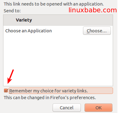 如果你的默认浏览器是Firefox,那么在Firefox的小窗口里选择Variety来打开variety://协议的链接.再点击确定.
