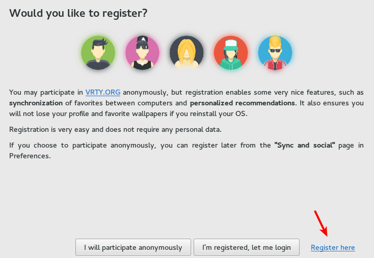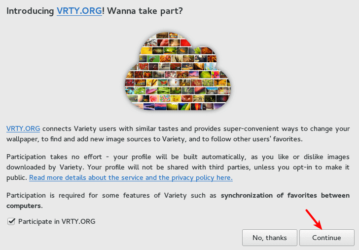 下一个窗口会邀请你在VRTY.ORG注册一个账号.VRTY.ORG有很多漂亮的壁纸,而且更新非常频繁.你可以在VRTY.ORG保存你喜欢的壁纸,并能直接在VRTY.ORG设置桌面壁纸.另外,注册账号还可以在不同的电脑之间同步你的壁纸.点击继续按钮.
