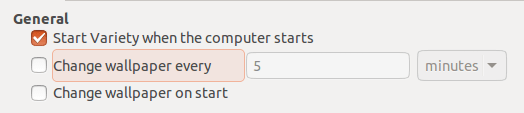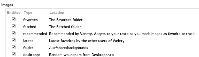 现在,Variety的配置窗口就会出现了.你可以设置多久更换一个壁纸.可以选择从哪些在线壁纸库获取壁纸.还可以添加一个本地文件夹作为壁纸库.