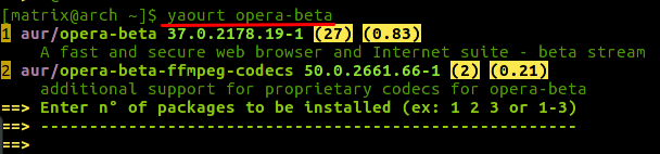 Arch Linux的community软件库收录了Opera稳定版,但Opera beta测试版在AUR仓库里。Arch Linux用户可以用Yaourt工具来安装Opera Beta。
