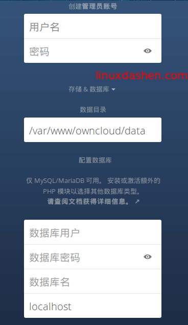 你需要设置一个管理员账号,输入之前创建的owncloud数据库,数据库用户名和密码,将ownCloud与MariaDB数据库服务器连接.