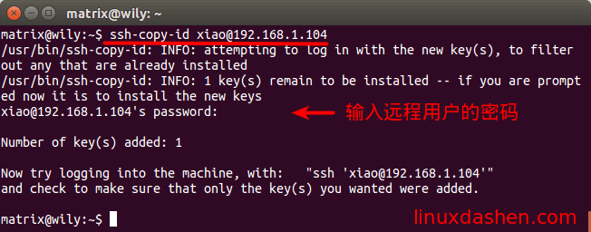 输入远程用户的密码后,SSH公钥就会自动上传了.SSH公钥保存在远程Linux服务器的.ssh/authorized_keys文件中.