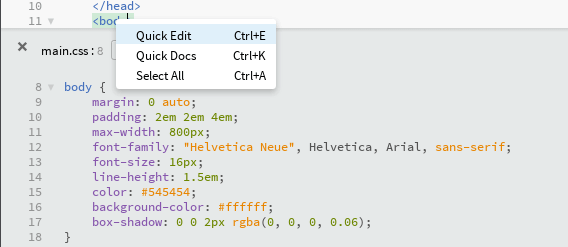 快速编辑可以让你专注于一个窗口,而不必在多个窗口之前切换.当鼠标指针在HTML标签里时,右击鼠标,选择快速编辑,就会打开HMTL标签对应的CSS样式.