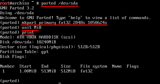 注意,我采用扇区(sector)作为分区的单位大小,我的虚拟硬盘逻辑扇区和物理扇区大小都为512字节。上面的命令刚好可以划分一个512MiB的EFI系统分区。你的硬盘逻辑扇区和物理扇区的大小很可能不一致。