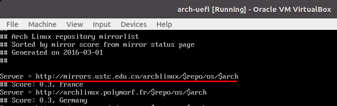 要选择一个镜像站点,将镜像站点的地址复制到镜像列表的最前面就行了。比如,我将中科大(ustc)的Arch Linux镜像站复制到了最前面。