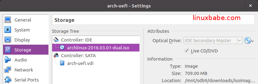 在启动虚拟机安装系统之前,我们需要在存储设置里添加Arch Linux的ISO镜像文件,不然启动虚拟机后会进入UEFI shell
